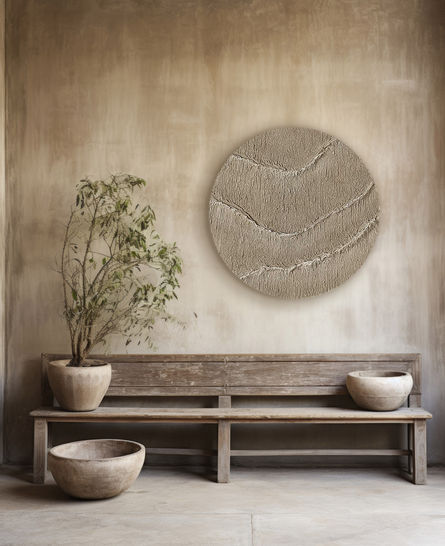 This work captures the essence of natural movement and harmony, inviting quiet reflection. The handcrafted textures, combined with the circular format, create a sculptural presence that enhances modern, minimalist, or nature-inspired interiors, blending sophistication with the tactile beauty of Wabi‑Sabi aesthetics.
