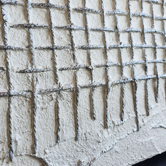 Displayed in a modern interior, Silver on White interacts with light and surrounding surfaces to create a dynamic visual flow. Its textured reliefs catch and reflect ambient light, while the minimalist palette allows the painting to harmonize effortlessly with other works, from photography to figurative art. The piece brings depth, luminosity, and a quiet sculptural presence, subtly transforming the atmosphere of any room into a space of contemporary elegance and tactile intrigue.